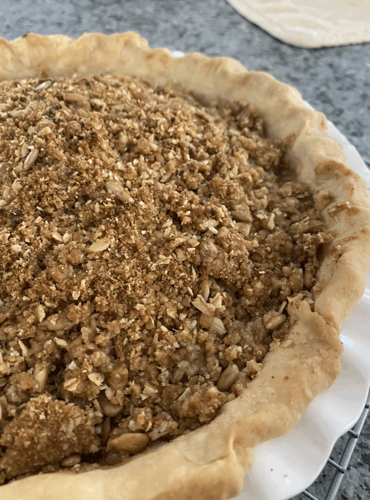 What makes this pie truly special is the topping. It’s not just a crumble—it’s a textured, flavorful, slightly unexpected blend of oats, brown sugar, flour, and bran buds (yes, bran!). The bran adds the perfect hearty crunch without making the pie heavy, and when you mix in cold butter and a handful of sunflower seeds, the crumble bakes into this golden, nutty, crisp layer that pairs beautifully with the soft, warm apples underneath.